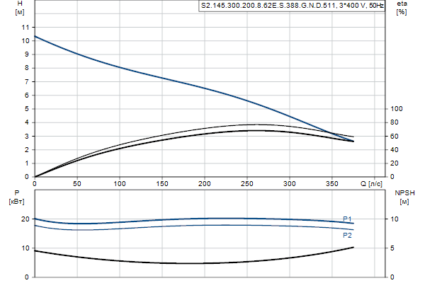 Насос предназначен для периодической и непрерывной эксплуатации в погруженном положении. Двухканальное рабочее колесо пропускает твердые частицы размером до 145 мм .