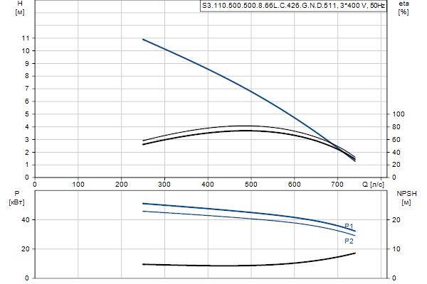 Насос предназначен для периодической и непрерывной эксплуатации. Охлаждающий кожух обеспечивает возможность работы насоса, установленного в погруженном или «сухом» положении, без охлаждения электродвигателя. Трехканальное рабочее колесо пропускает твердые частицы размером до 110 мм .