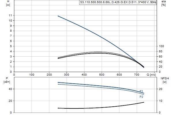 Насос предназначен для периодической и непрерывной эксплуатации. Охлаждающий кожух обеспечивает возможность работы насоса, установленного в погруженном или «сухом» положении, без охлаждения электродвигателя. Трехканальное рабочее колесо пропускает твердые частицы размером до 110 мм .