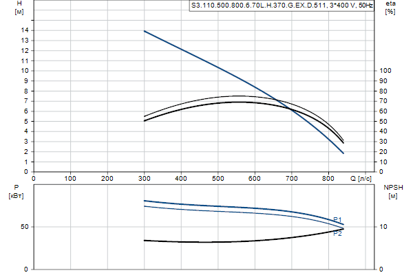 Насос предназначен для периодической и непрерывной эксплуатации. Охлаждающий кожух обеспечивает возможность работы насоса, установленного в погруженном или «сухом» положении, без охлаждения электродвигателя. Трехканальное рабочее колесо пропускает твердые частицы размером до 110 мм .