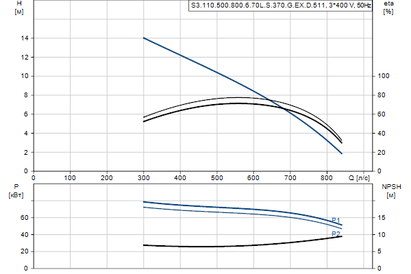 Насос предназначен для периодической и непрерывной эксплуатации в погруженном положении. Трехканальное рабочее колесо пропускает твердые частицы размером до 110 мм .