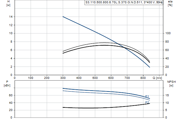 Насос предназначен для периодической и непрерывной эксплуатации в погруженном положении. Трехканальное рабочее колесо пропускает твердые частицы размером до 110 мм .