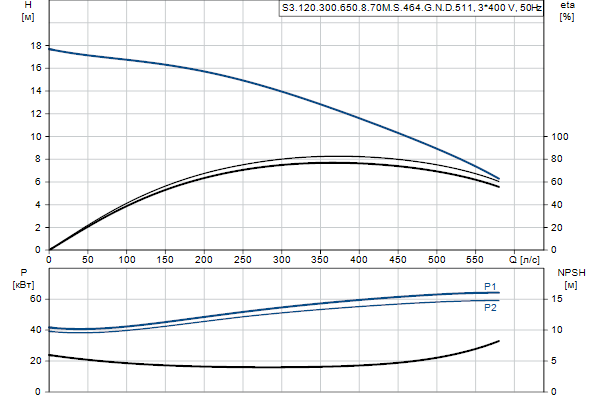 Насос предназначен для периодической и непрерывной эксплуатации в погруженном положении. Трехканальное рабочее колесо пропускает твердые частицы размером до 120 мм .