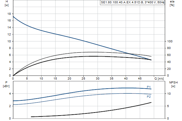 SE1.80.100.40.A.EX.4.51D.BНесамовсасывающий одноступенчатый центробежный насос, предназначенный для перекачивания сточных вод, технологических вод и неочищенных сточных вод, не пропущенных через решетку. Насос предназначен для периодической и непрерывной эксплуатации. Безжидкостная система охлаждения, не требующая технического обслуживания, обеспечивает возможность использования насоса при установке в погруженном положении или «сухой» установке. Рабочее колесо S-tube® обеспечивает свободный сферический проход твердых частиц до 80 мм и подходит для сточных вод с содержанием сухих веществ до 3%. Уникальная система монтажа с помощью хомута из нержавеющей стали позволяет быстро и легко выполнять демонтаж насоса с узла электродвигателя для технического обслуживания и осмотра. Не требуются никакие специальные инструменты. Соединение трубопровода обеспечивается с использованием фланца DIN . Насос имеет взрывобезопасное исполнение.