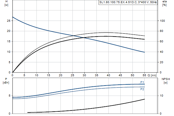 SL1.80.100.75.EX.4.51D.CНесамовсасывающий одноступенчатый центробежный насос, предназначенный для перекачивания сточных вод, технологических вод и неочищенных сточных вод, не пропущенных через решетку. Насос предназначен для периодической и непрерывной эксплуатации в погруженном положении. Рабочее колесо S-tube® обеспечивает свободный сферический проход твердых частиц до 80 мм и подходит для сточных вод с содержанием сухих веществ до 3%. Уникальная система монтажа с помощью хомута из нержавеющей стали позволяет быстро и легко выполнять демонтаж насоса с узла электродвигателя для технического обслуживания и осмотра. Не требуются никакие специальные инструменты. Соединение трубопровода обеспечивается с использованием фланца DIN . Насос имеет взрывобезопасное исполнение.