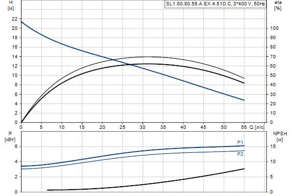 SL1.80.80.55.A.EX.4.51D.CНесамовсасывающий одноступенчатый центробежный насос, предназначенный для перекачивания сточных вод, технологических вод и неочищенных сточных вод, не пропущенных через решетку. Насос предназначен для периодической и непрерывной эксплуатации в погруженном положении. Рабочее колесо S-tube® обеспечивает свободный сферический проход твердых частиц до 80 мм и подходит для сточных вод с содержанием сухих веществ до 3%. Уникальная система монтажа с помощью хомута из нержавеющей стали позволяет быстро и легко выполнять демонтаж насоса с узла электродвигателя для технического обслуживания и осмотра. Не требуются никакие специальные инструменты. Соединение трубопровода обеспечивается с использованием фланца DIN . Насос имеет взрывобезопасное исполнение.