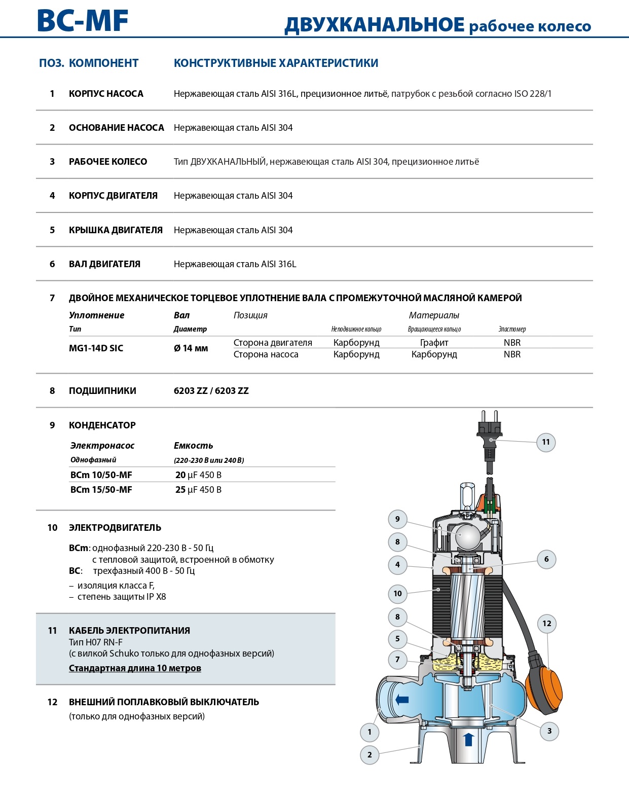 Погружные насосы BC-MF рекомендуются для подъема воды со значительной и сильной степенью загрязнения, применимы в домашнем и коммунальном хозяйстве. Они оснащены ДВУХКАНАЛЬНЫМ рабочим колесом из нержавеющей стали, которое обеспечивает перекачку жидкостей с присутствием во взвеси коротковолокнистых твердых частиц диаметром до Ø 50 мм. Они рекомендуются для отвода сточных вод и нечистот, поверхностных вод, смеси воды с илом на таких объектах, как дачи, коттеджи и дома индивидуальной застройки. Эти насосы отличаются надежностью в автоматических стационарных установках.