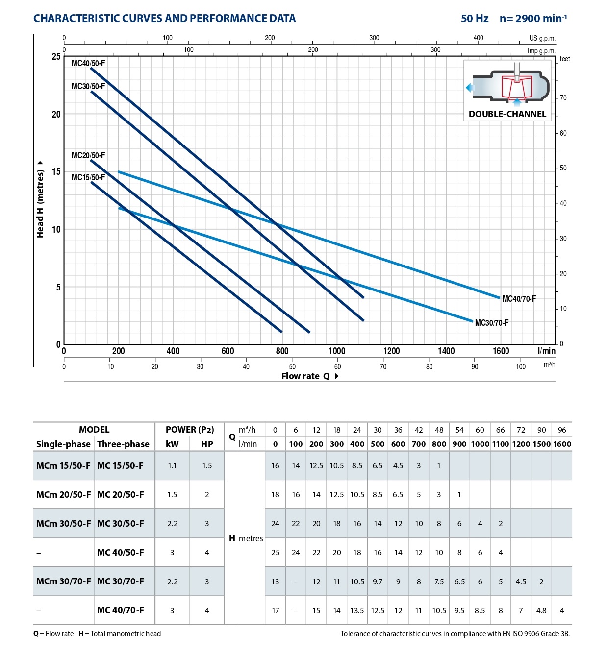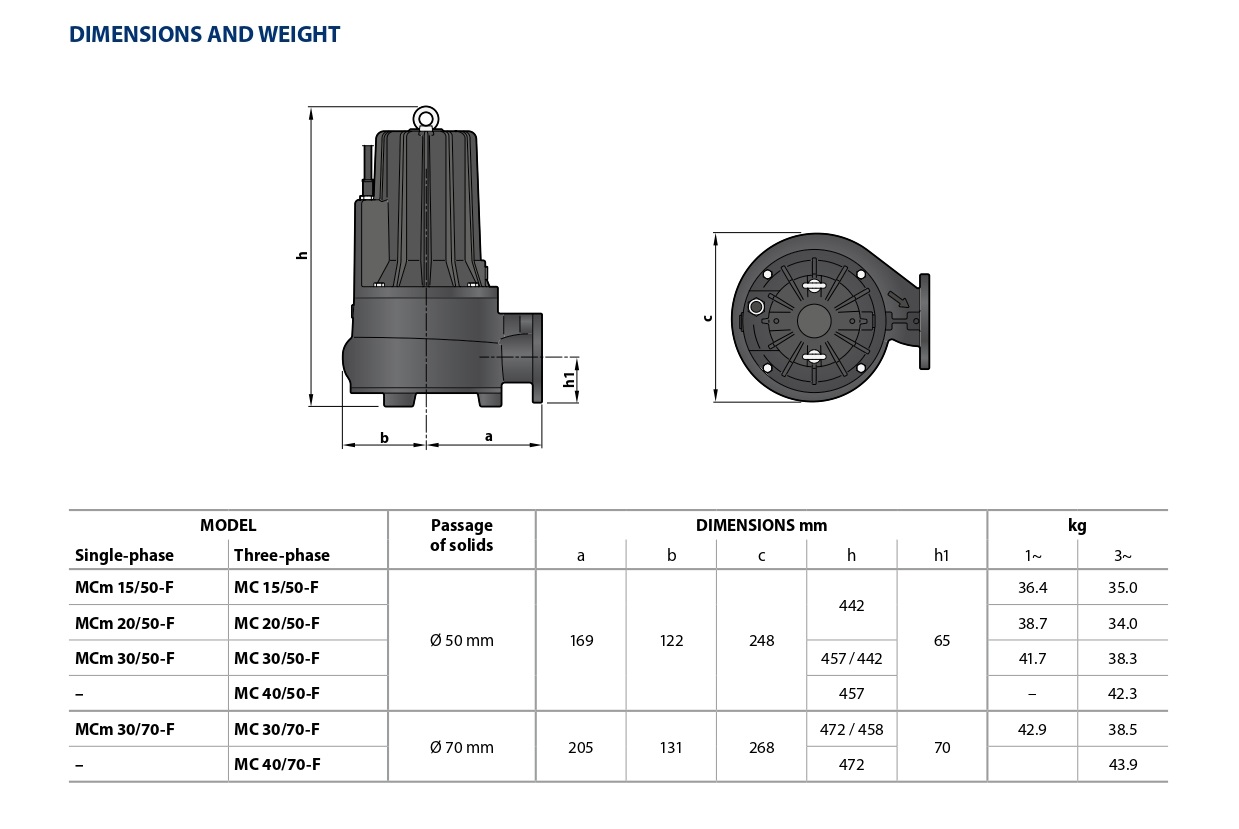 Насосы серии MC-F, изготовленные из прочного чугуна значительной толщины, прочностью и устойчивостью к абразивному воздействию, а также долговечностью, оснащены ДВУХКАНАЛЬНЫМ рабочим колесом из нержавеющей стали, которое позволяет отводить жидкости с коротковолокнистыми твердыми частицами во взвешенном состоянии. Они подходят для транспортировки сбрасываемой и канализационной воды, грязной воды, воды, смешанной с грязью, грунтовых и поверхностных вод, для применений, при размещении в подходящих колодцах, в многоквартирных домах, общественных зданиях, на промышленных предприятиях, многоэтажных и подземных автостоянках, а также для автомоек.