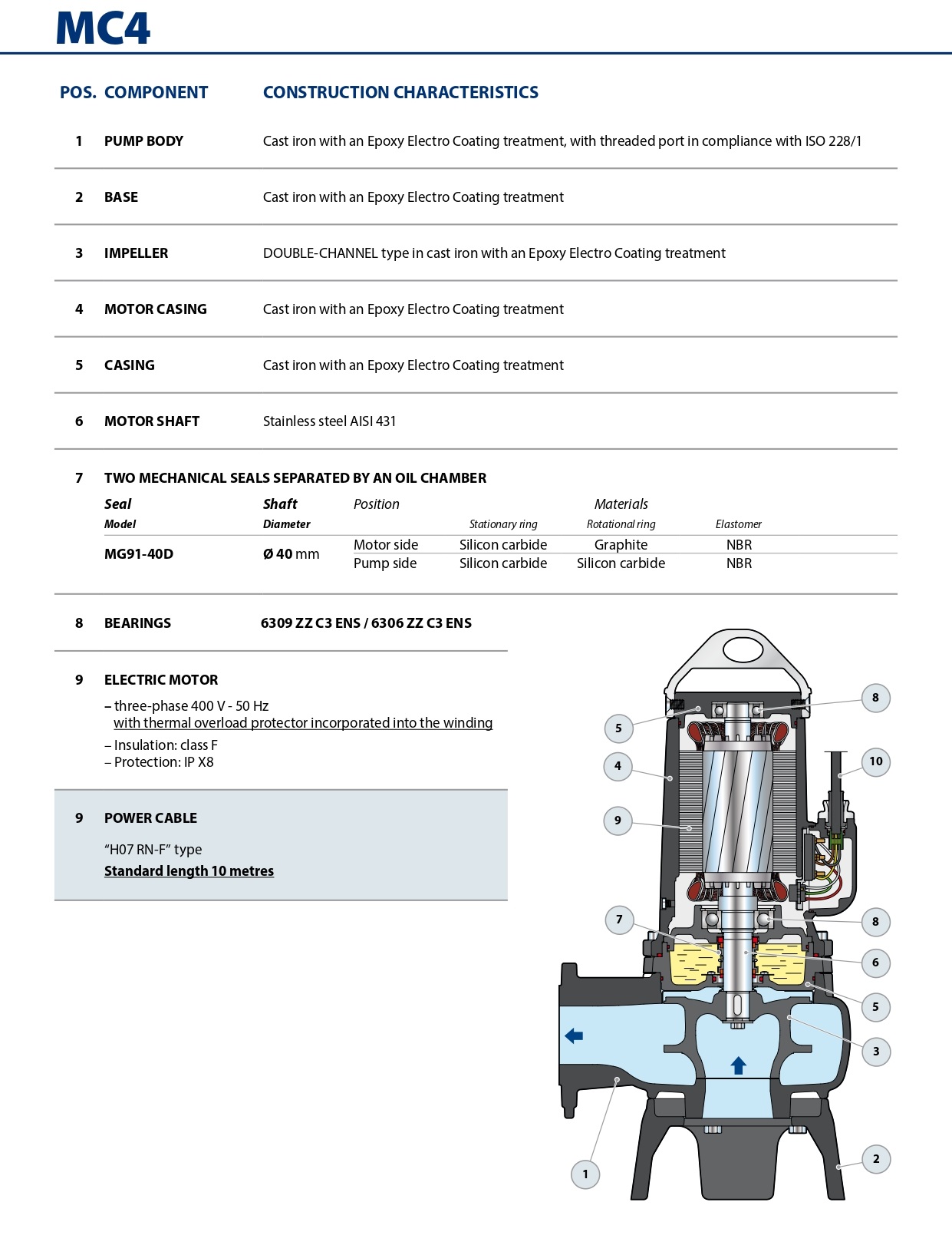 Насосы серии MC4, изготовленные из прочного долговечного чугуна, оснащены рабочим колесом DOUBLE-CHANNEL и способны перекачивать жидкости, содержащие взвешенные твердые частицы с короткими волокнами. Они идеально подходят для перекачки сточных вод, воды, смешанной с грязью, грунтовых и поверхностных вод в таких местах, как многоквартирные дома, общественные здания, фабрики, многоэтажные и подземные автостоянки, моечные зоны и т.д.