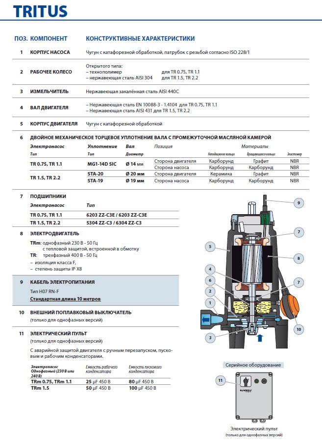 Насосы серии TRITUS с измельчителем, изготовленные из толстостенного чугуна, характеризующегося высокой прочностью, стойкостью к абразивному воздействию и долговечностью. Насосы оснащены ИЗМЕЛЬЧИТЕЛЕМ из закалённой нержавеющей стали, что позволяет измельчать твёрдые частицы и волокна, содержащиеся в сточных водах бытового и коммунального секторов, для последующего перекачивания под давлением в канализационной системе по трубам малого диаметра.