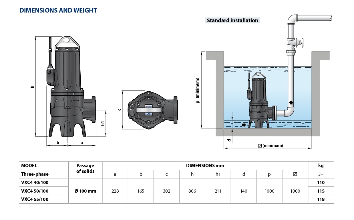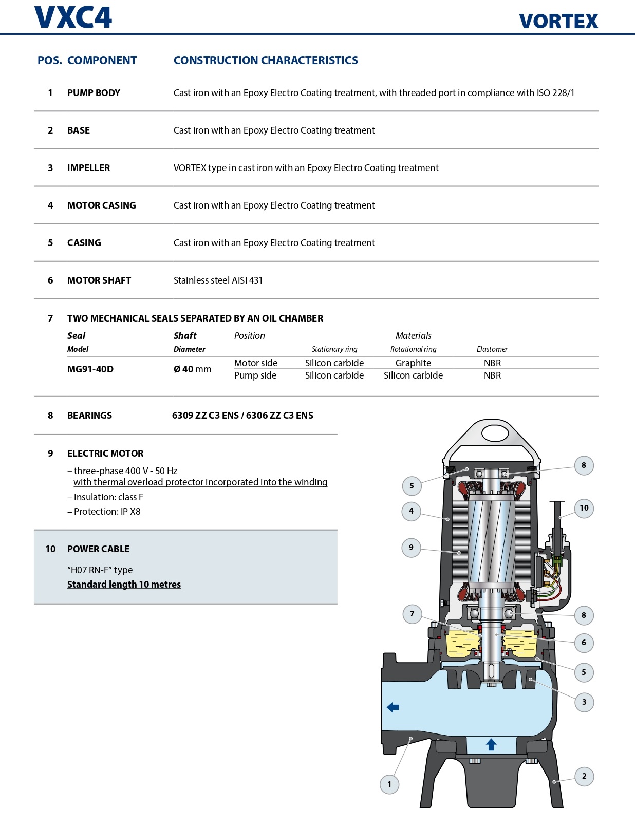 Насосы серии VXC4, изготовленные из толстого чугуна, не подверженного истиранию и долговечны, оснащены рабочим колесом VORTEX и, следовательно, подходят для слива грязной, сточной и обратной воды, а также воды, смешанной с гнилостным раствором. Они подходят для установки в канализацию, туннели, земляные работы, каналы, подземные автостоянки и т. д.