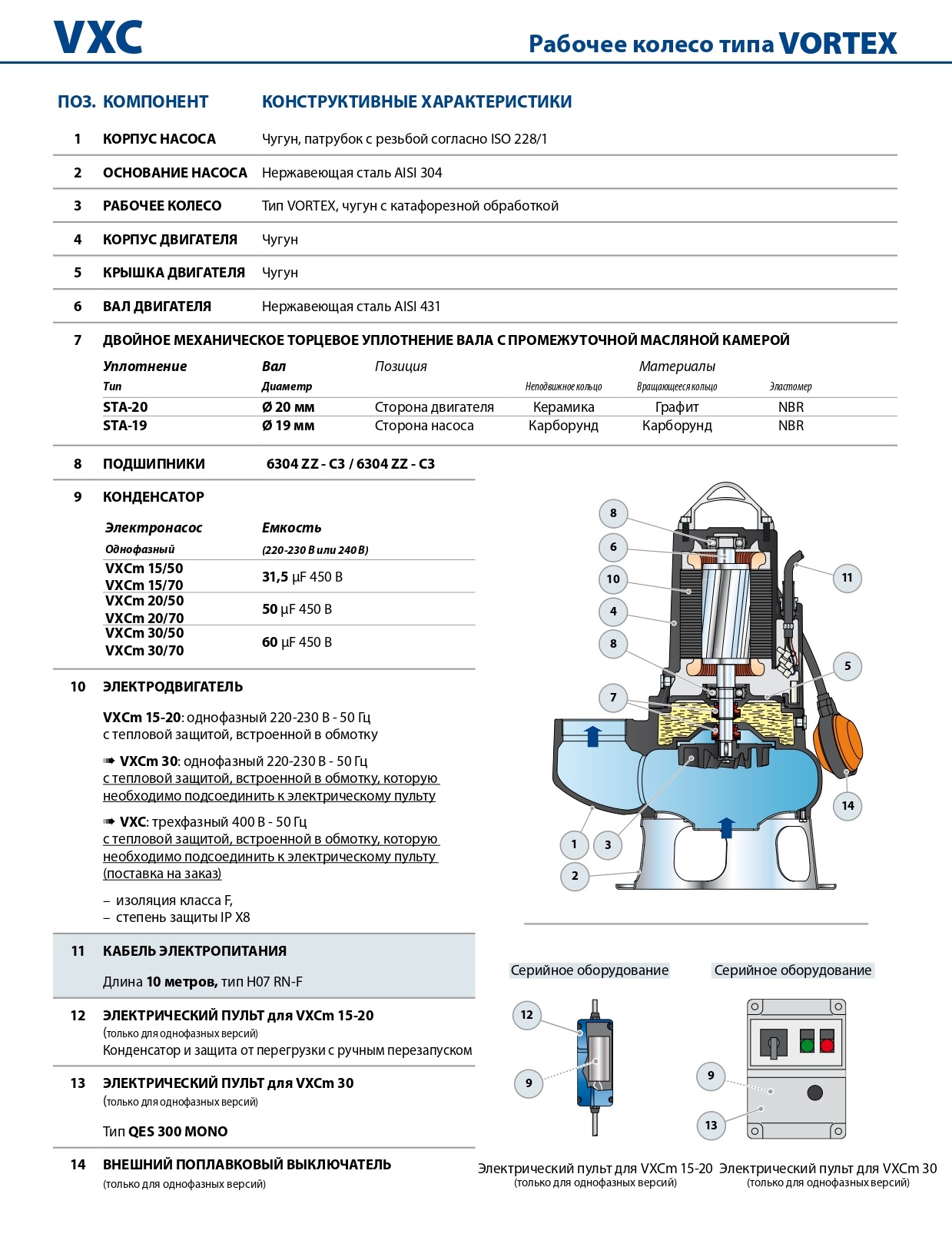 Насосы серии VXC изготовлены из чугуна, значительной толщины, эти насосы отличаются чрезвычайной прочностью и устойчивостью к абразивному воздействию, оснащены рабочим колесом типа VORTEX. Они предназначены для откачки вод, содержащих твердые частицы во взвешенном состоянии, загрязненных, сточных вод в смеси с грязью, а также регенерированных и гниющих шламов. Эти насосы особо рекомендуются для установки в канализационных системах, туннелях, котлованах, каналах, подземных гаражах и т.д.