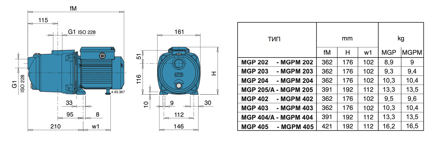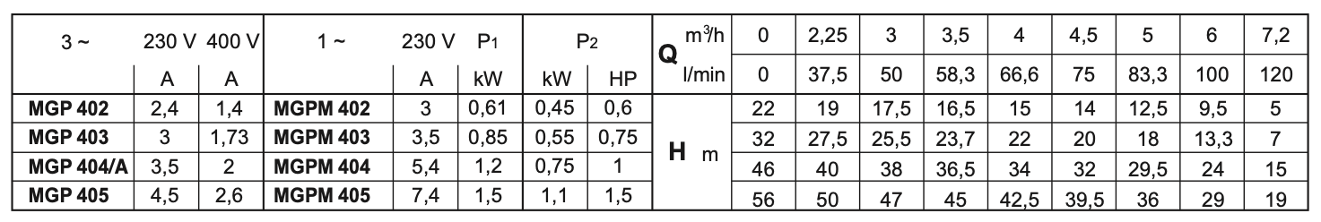 Calpeda MGP — моноблочные горизонтальные многоступенчатые насосы. Корпус монолитный из чугуна, открыт только с одной стороны (барабанного типа), фронтальный всасывающий раструб расположен выше вала, а радиальный подающий раструб — вверху. Ступени изготовлены из норила.