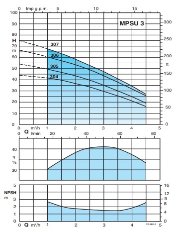 Насос Calpeda MPSU 305 - моноблочный вертикальный многоступенчатый насос из нержавеющей стали AISI 304. Ступени изготовлены из норила(пластик который характеризуется высокой прочностью, стойкостью к ударным нагрузкам, в своем составе имеет 20% стекловолокна). Всасывающий раструб снизу и подающий раструб сверху. Двигатель сверху охлаждаются перекачиваемой водой. Двойное уплотнение на валу в масляной камере для надежной защиты двигателя от воды и для защиты от сухого хода. Для чистой воды без содержания абразивных частиц и веществ. Использование в быту и промышленности.