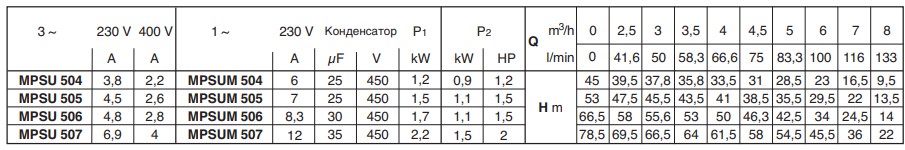 Насос Calpeda MPSU 506 - моноблочный вертикальный многоступенчатый насос из нержавеющей стали AISI 304. Ступени изготовлены из норила(пластик который характеризуется высокой прочностью, стойкостью к ударным нагрузкам, в своем составе имеет 20% стекловолокна). Всасывающий раструб снизу и подающий раструб сверху. Двигатель сверху охлаждаются перекачиваемой водой. Двойное уплотнение на валу в масляной камере для надежной защиты двигателя от воды и для защиты от сухого хода. Для чистой воды без содержания абразивных частиц и веществ. Использование в быту и промышленности.