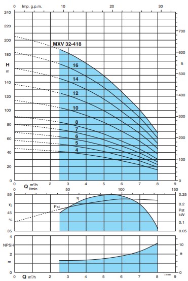 Calpeda MXV — многорядные вертикальные многоступенчатые насосы со всасывающим и подающим раструбами, имеющими одинаковый диаметр и расположенными на одном и том же валу. Направляющие втулки устойчивы к коррозии и смазываются перекачиваемой жидкостью. Применяются для водоснабжения, перекачивания чистых, невзрывоопасных жидкостей, не содержащих абразивных твердых или волокнистых примесей и не агрессивных к нержавеющей стали. Универсальный насос для использования в бытовой и промышленной сферах, в установках повышения давления, противопожарных установках, высоконапорных моечных устройствах, для полива, в сельском хозяйстве, в спортивных сооружениях.