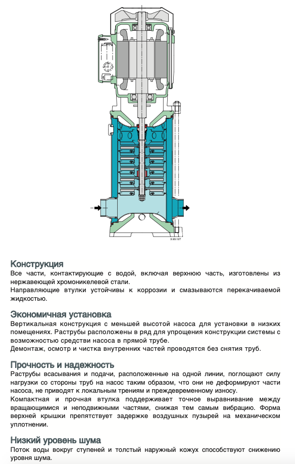 Применяется в водоснабжении. Для перекачки чистых невзрывоопасных жидкостей, не содержащих абразивных твердых или волокнистых примесей и неагрессивных к нержавеющей стали (по требованию устанавливается уплотнение из особого материала).