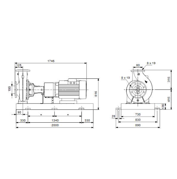 Несамовсасывающий, одноступенчатый, центробежный, насос со спиральной направляющей камерой разработан в соответствии с ISO 5199, при этом его размер и номинальная мощность соответствуют EN 733. Фланцы - PN 16 с размерами в соответствии с EN 1092-2. Насос оборудован осевым всасывающим, радиальным выходным патрубками и горизонтальным валом. Он имеет конструкцию с разборной муфтой, что обеспечивает демонтаж муфты, кронштейна подшипника и рабочего колеса, не демонтируя электродвигатель, корпус насоса или трубную обвязку.