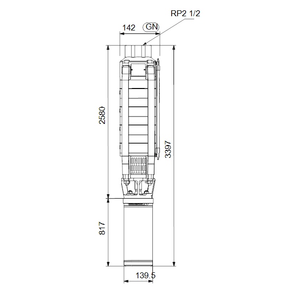 Насос оснащен электродвигателем MS600022 кВт с защитой от песка, торцевым уплотнением вала, опорными подшипниками с водяной смазкой и мембраной для компенсации объема. Электродвигатель представляет собой погружной двигатель в герметическом исполнении, обладающий хорошей механической стабильностью и высоким КПД. Подходит для температур до 40 °C.