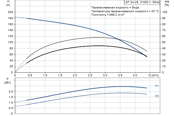 Насос оснащен электродвигателем MS4022.2 кВт с защитой от песка, манжетным уплотнением, опорными подшипниками с водяной смазкой и мембраной для компенсации объема. Электродвигатель представляет собой погружной двигатель в герметическом исполнении, обладающий хорошей механической стабильностью и высоким КПД. Подходит для температур до 40 °C.