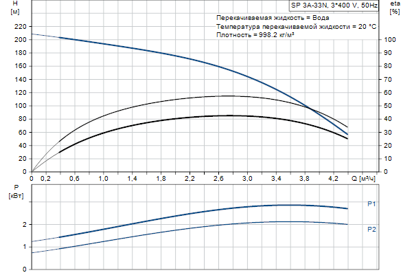 Насос оснащен электродвигателем MS40002.2 кВт с защитой от песка, торцевым уплотнением вала, опорными подшипниками с водяной смазкой и мембраной для компенсации объема. Электродвигатель представляет собой погружной двигатель в герметическом исполнении, обладающий хорошей механической стабильностью и высоким КПД. Подходит для температур до 40 °C.