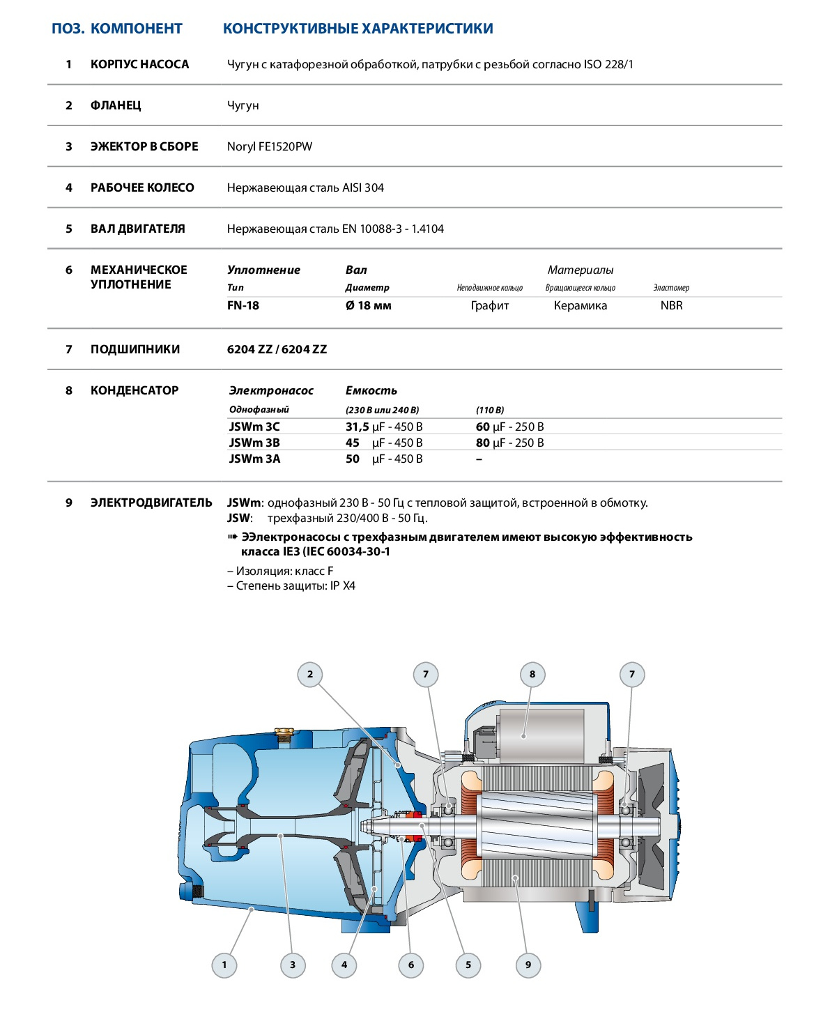 Самовсасывающие електронасосы серии JSW подходят для использования с чистой водой и жидкостями, которые не являются химически агрессивным по отношению к материалам, из которых изготовлен насос. Они предназначены для перекачивания воды даже в тех случаях, когда в ней присутствует воздух. Благодаря своей надежности и простоте использования, эти насосы широко используются в бытовых целях, таких как распределение воды в сочетании с небольшими и средними гидроаккумуляторами, для орошения садов и огородов и т.д. Насос должен быть установлен в закрытом и защищенном от непогоды помещении.