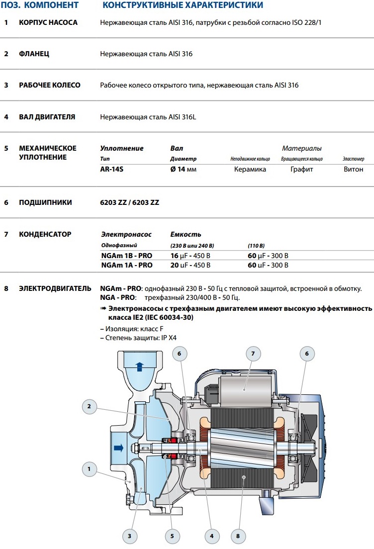 Центробежные электронасосы серии NGA-PRO из нержавеющей стали рекомендуются для перекачки воды и химически неагрессивных жидкостей для материалов, из которых изготовлен насос. Конструктивное решение рабочего колеса, открытого типа, позволяет перемещать относительно загрязненныежидкости. Все компоненты, входящие в контакт с перекачиваемой жидкостью, изготовлены из нержавеющей стали AISI 316. Благодаря этой характеристике насосы серии NGA-PRO находят применения в установках для мойки овощей, фруктов, рыбы, моллюсков, в установках промышленной мойки и в системах циркуляции охлаждающих жидкостей. Установка насоса должна производиться в закрытых помещениях или же в местах, защищенных от атмосферного воздействия.