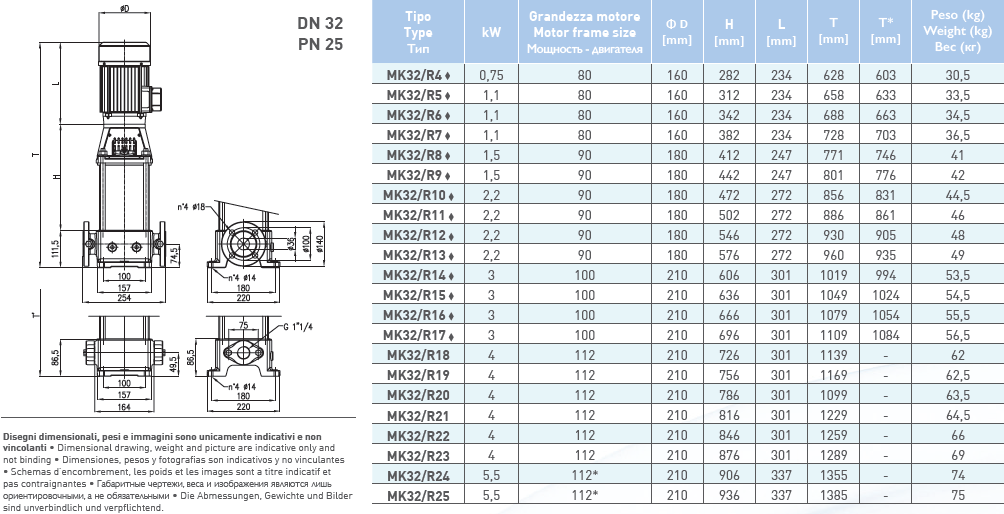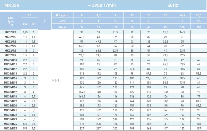 Электронасосы многоступенчатые вертикальные, не самозаливающиеся, минимальных габаритов, пригодные для подъемных систем с автоклавами или без них, ирригационных систем и другого оборудования, требующего повышенных давлений. PMK: насос со свободным концом вала, MK: узел насоса с электродвигателем. Насосы и двигатели соответствуют директиве по энергопотребляющей продукции 2009/125/CE (ErP)