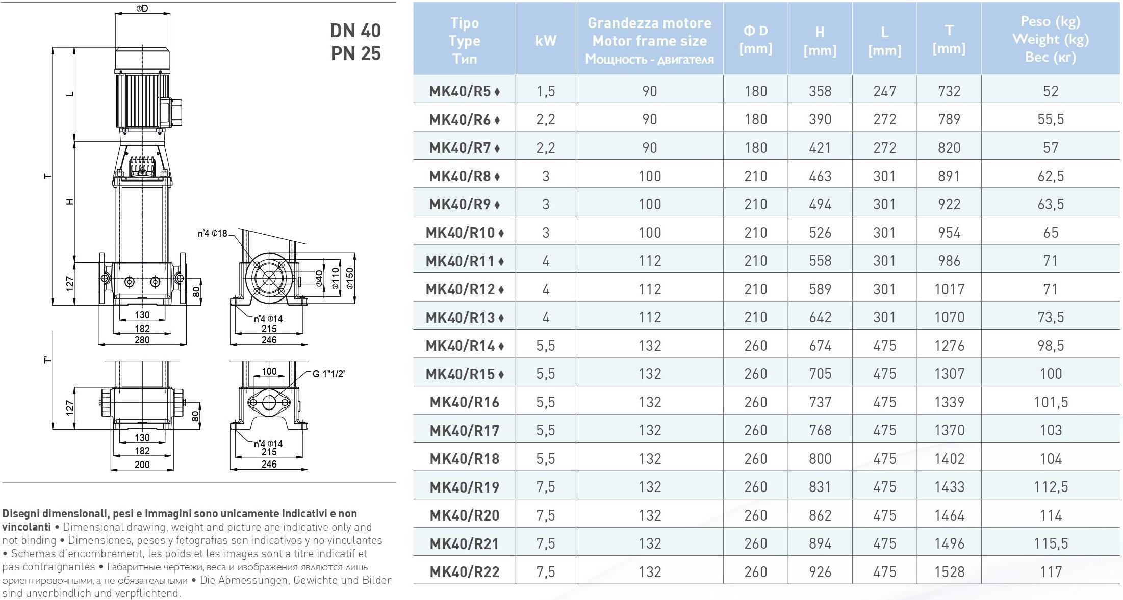Электронасосы многоступенчатые вертикальные, не самозаливающиеся, минимальных габаритов, пригодные для подъемных систем с автоклавами или без них, ирригационных систем и другого оборудования, требующего повышенных давлений. PMK: насос со свободным концом вала, MK: узел насоса с электродвигателем. Насосы и двигатели соответствуют директиве по энергопотребляющей продукции 2009/125/CE (ErP)
