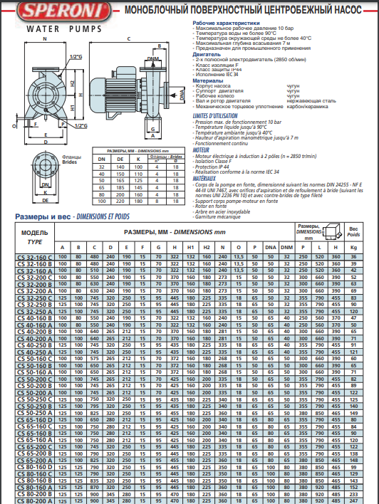 Центробежный, выполненный в одном корпусе, одноступенчатый электронасос изготовленный по DIN 24255 - NFE44-II - UNI 7467 стандартам. Соединение насоса и двигателя осуществляется через промежуточный фланец. Этот насос идеален для перекачивания чистой воды и других химически и механически не агрессивных жидкостей. Если предполагается перекачивать жидкость, плотность и/или вязкость которой отличается от тех же параметров воды, то вследствие изменения гидравлической мощности необходимо учитывать потребную в этом случае мощность электродвигателя.